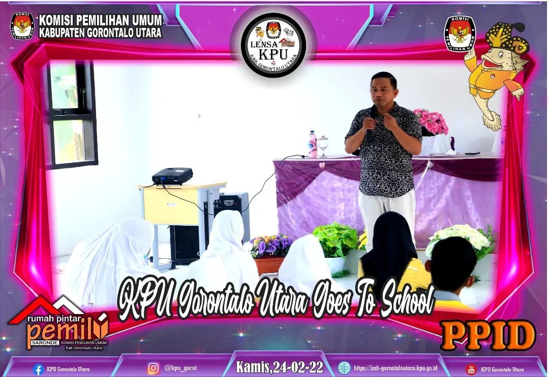 #TemanPemilih.Kwandang (24/02/22). Komisi Pemilihan Umum Kab. Gorontalo Utara kali ini melaksanakan kegiatan sosialisasi Goes To School di SMA Negeri 7 Gorontalo Utara. Ketua KPU Kabupaten Gorontalo Utara Munawir Ismail memberikan sosialisasi tentang kepemiluan. sosialisasi yang dilaksanakan tetap mematuhi Protokol Kesehatan menjaga jarak dan menggunakan masker.