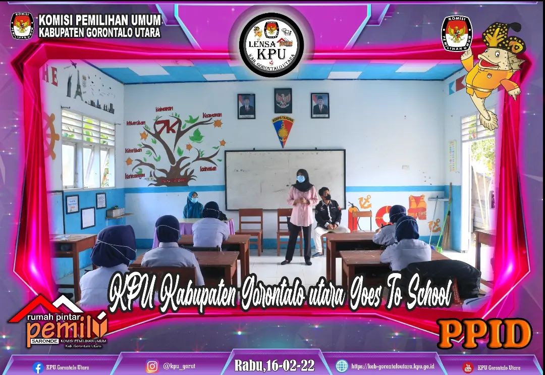 #TemanPemilih. Kwandang, Rabu (16/02/2022). Komisi Pemilihan Umum (KPU) Kabupaten Gorontalo Utara melaksanakan kegiatan sosialisasi Goes to school di SMK Taruna Bahari yang berada di Kecamatan Tomilito. Ketua Divisi Sosialisasi, Pendidikan Pemilih, Partisipasi Masyarakat dan SDM Febiani Yovita Salindeho dalam materinya menyampaikan beberapa hal, diantaranya informasi hari pemungutan suara pemilu serentak tahun 2024, syarat menjadi pemilih serta tingkat partisipasi masyarakat.