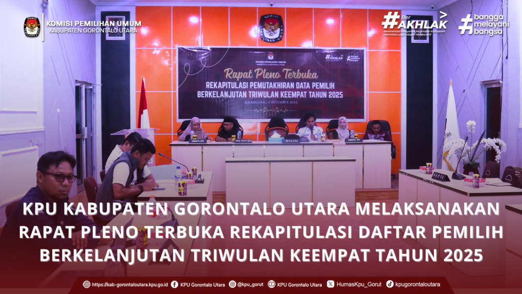 #TemanPemilih KPU Kabupaten Gorontalo Utara melaksanakan Rapat Pleno Terbuka Rekapitulasi Pemutakhiran Data Pemilih Berkelanjutan (PDPB) Triwulan keempat Tahun 2025 yang bertempat di Aula RPP Saronde. Kegiatan ini merupakan langkah evaluasi berkala untuk memastikan data pemilih tetap mutakhir dan selaras dengan perubahan kondisi kependudukan di masyarakat. (15/12/2025) Pleno dipimpin oleh Ketua KPU Gorontalo Utara, Sofyan Jakfar, dan turut dihadiri oleh Anggota KPU Provinsi Gorontalo, Risan Pakaya. Hadir pula Bawaslu Kabupaten Gorontalo Utara, TNI dan Polri, Dinas Kependudukan dan Pencatatan Sipil Kabupaten Gorontalo Utara, serta Dinas Pemberdayaan Masyarakat dan Desa (PMD) sebagai pihak yang berkolaborasi dalam mendukung kelancaran proses pemutakhiran data pemilih. Dalam pleno tersebut, Anggota KPU Gorontalo Utara, Yudistirachmatika Saleh, menyampaikan hasil rekapitulasi PDPB Triwulan keempat yang memuat perkembangan data seperti penambahan pemilih baru, pemilih yang tidak memenuhi syarat, serta perubahan elemen data. Seluruh proses dipaparkan secara terbuka agar peserta dapat memberikan masukan maupun klarifikasi apabila diperlukan. Sebagai penutup kegiatan, Ketua KPU Gorontalo Utara Sofyan Jakfar membacakan Berita Acara Rekapitulasi PDPB Triwulan keempat Tahun 2025 di hadapan seluruh peserta. Melalui agenda ini, KPU Gorontalo Utara berharap kerja sama yang terjalin dengan seluruh pihak semakin kuat sehingga data pemilih yang dihasilkan benar-benar mencerminkan kondisi faktual masyarakat dan menjadi dasar penting dalam penyelenggaraan Pemilu yang berintegritas dan demokratis