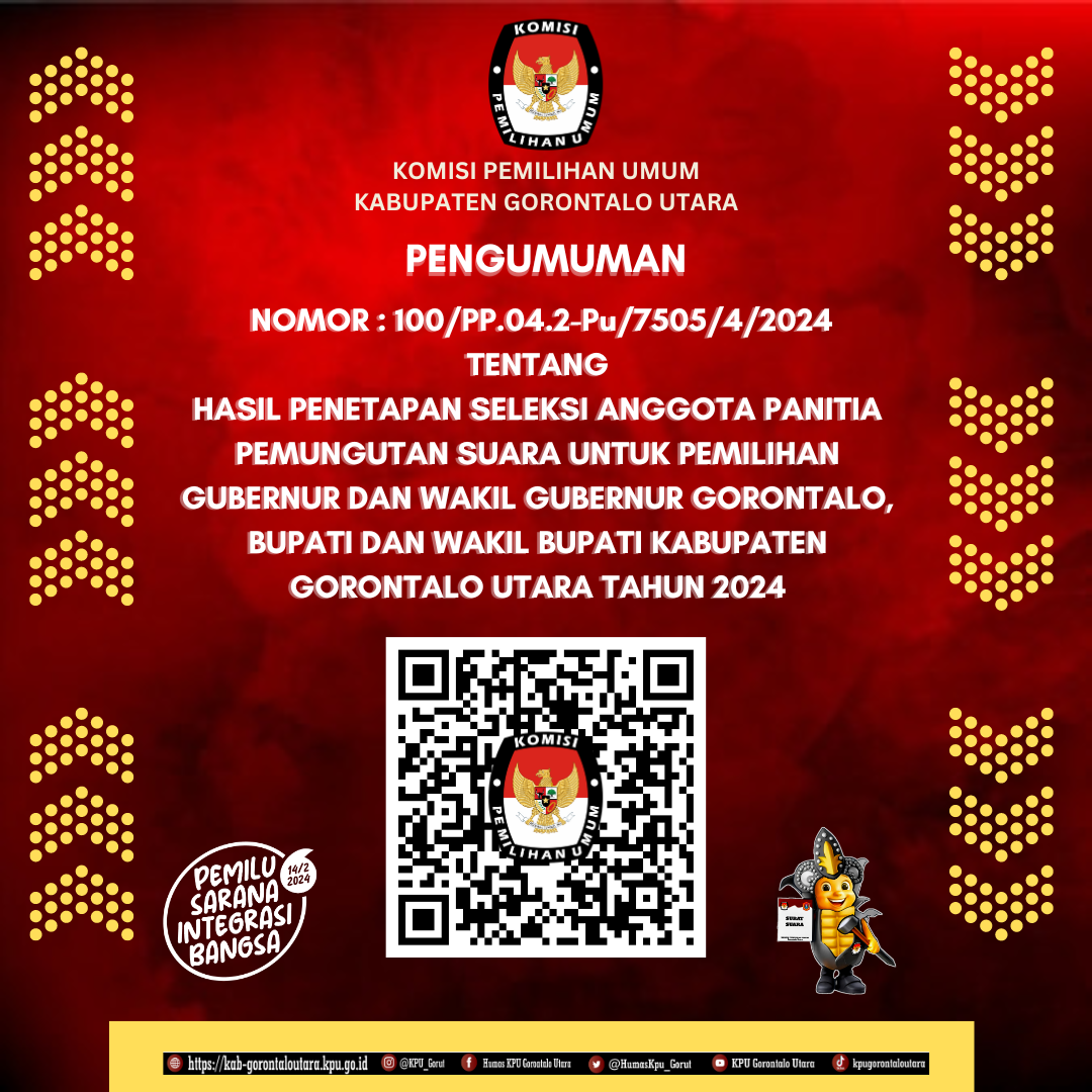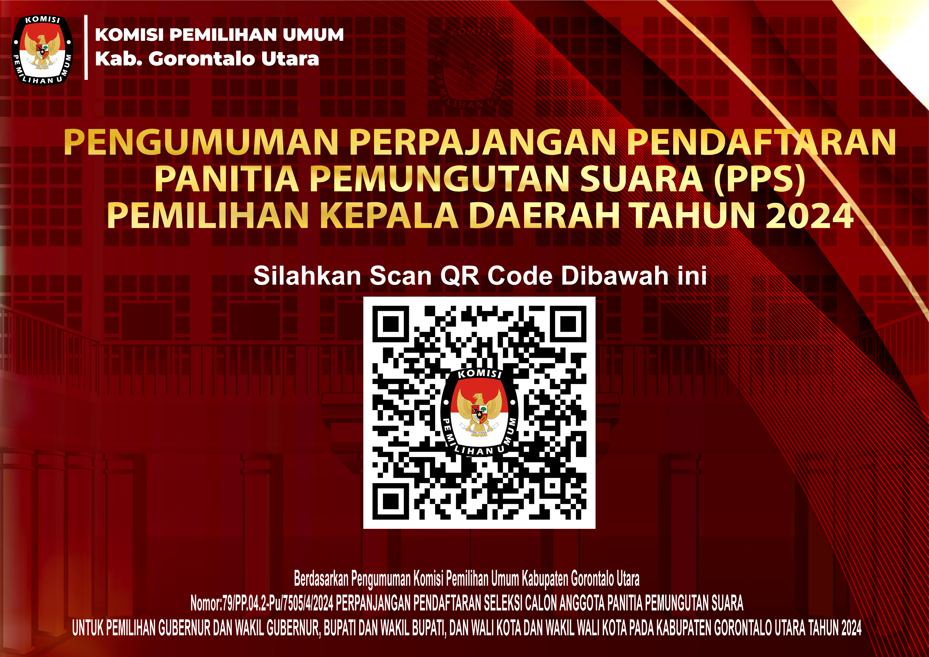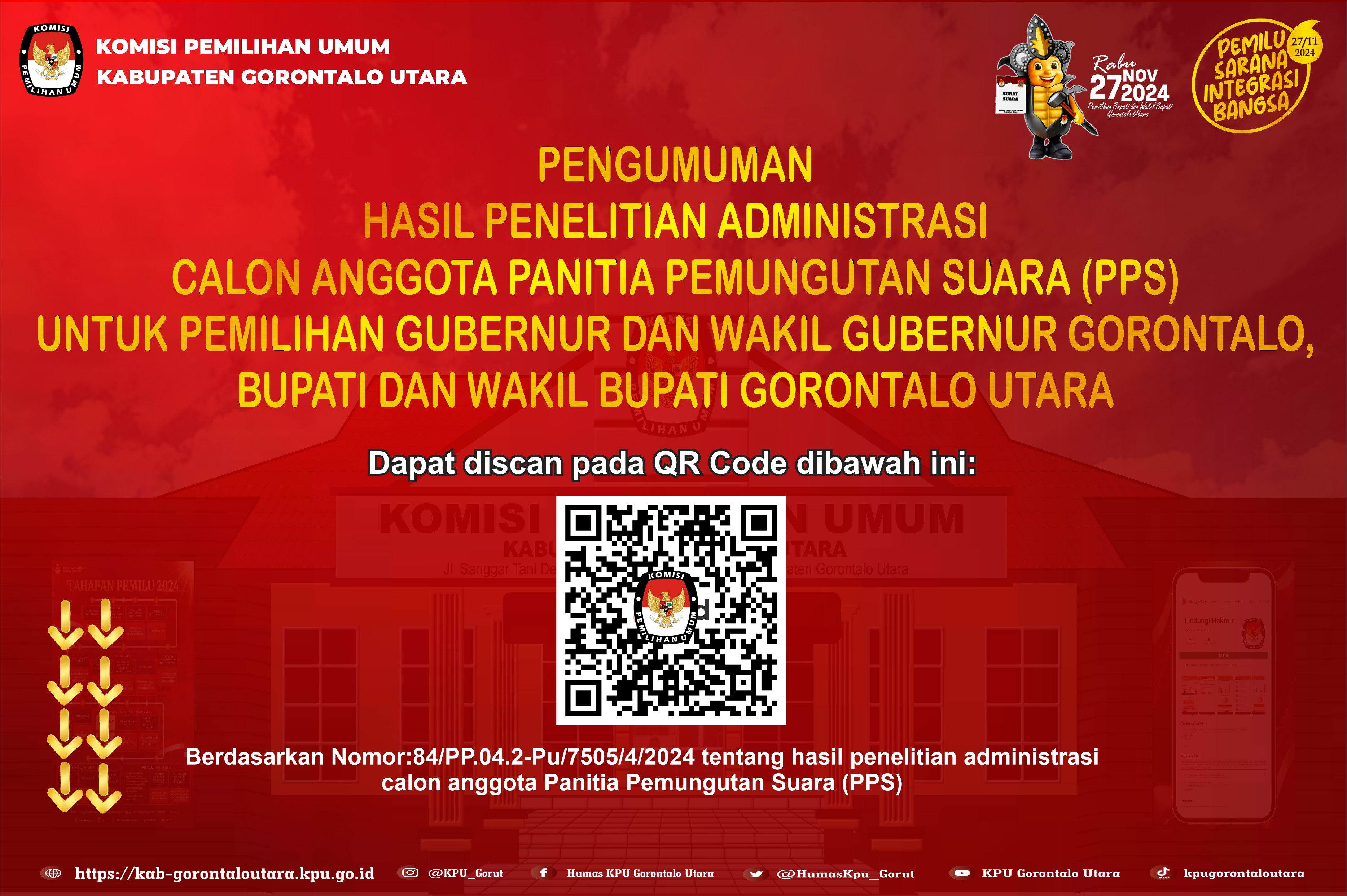 Berdasarkan pengumuman KPU Kbaupaten Gorontalo Utara Nomor:84/PP.04.2-Pu/7505/4/2024 tentang Hasil Penelitian Administrasi Calon Anggota Panitia Pemungutan Suara (PPS) untuk Pemilihan Gubernur dan Wakil Gubernur Gorontalo, Nupati dan wakil Bupati Gorontalo Utara Tahun 2024.