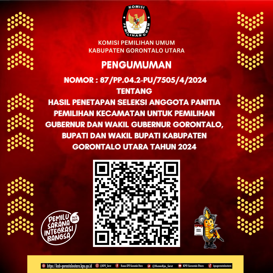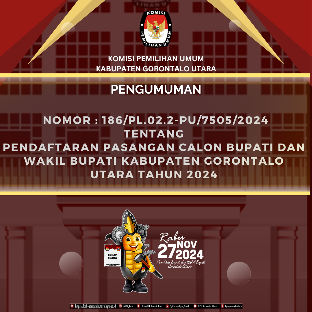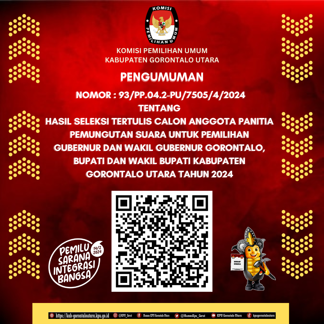 Berdasarkan pengumuman KPU Kbaupaten Gorontalo Utara Nomor:84/PP.04.2-Pu/7505/4/2024 tentang Hasil Penelitian Administrasi Calon Anggota Panitia Pemungutan Suara (PPS) untuk Pemilihan Gubernur dan Wakil Gubernur Gorontalo, Nupati dan wakil Bupati Gorontalo Utara Tahun 2024.