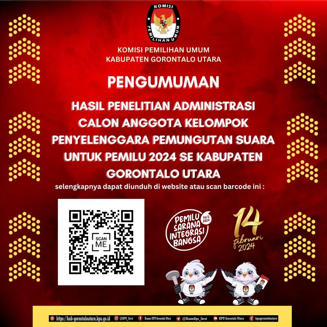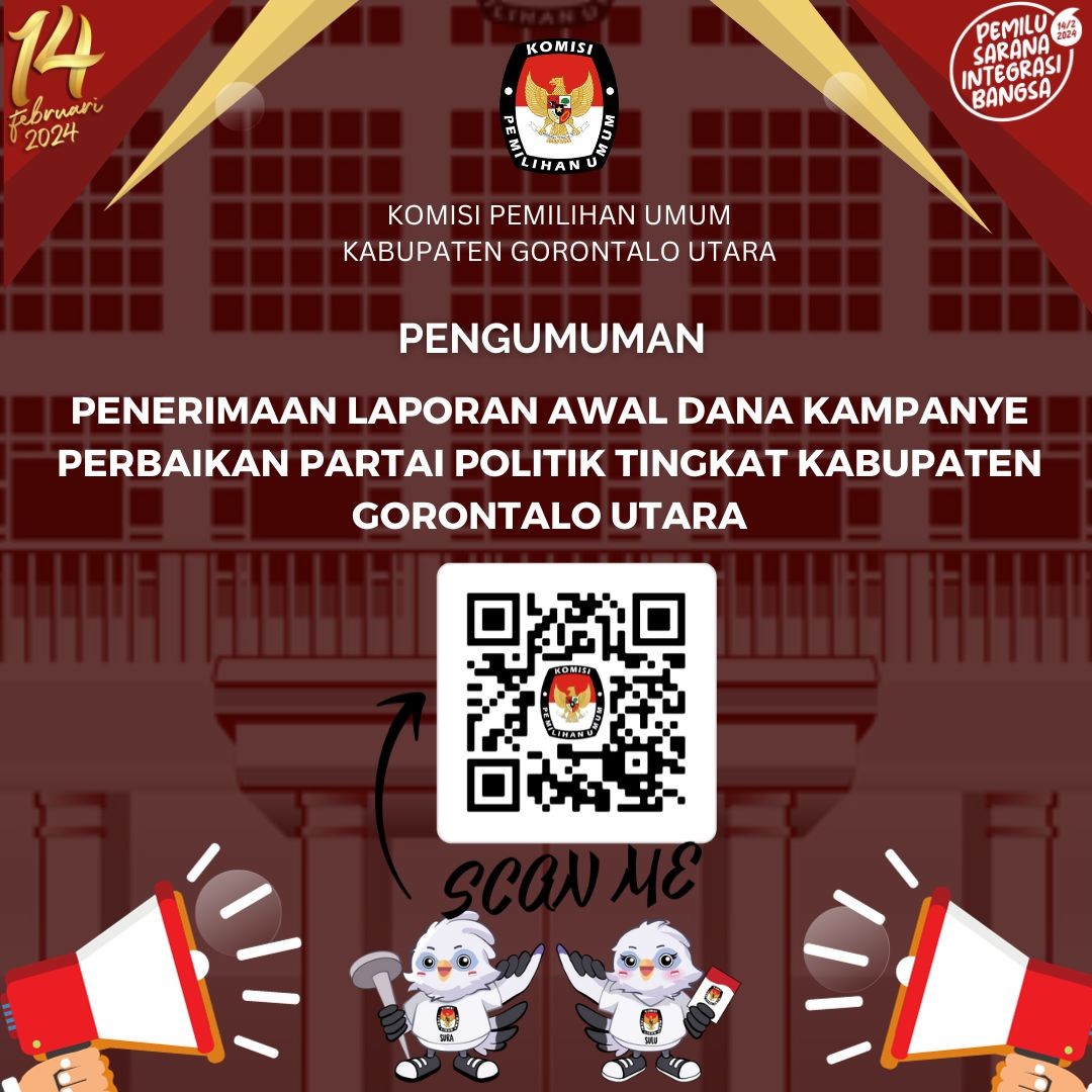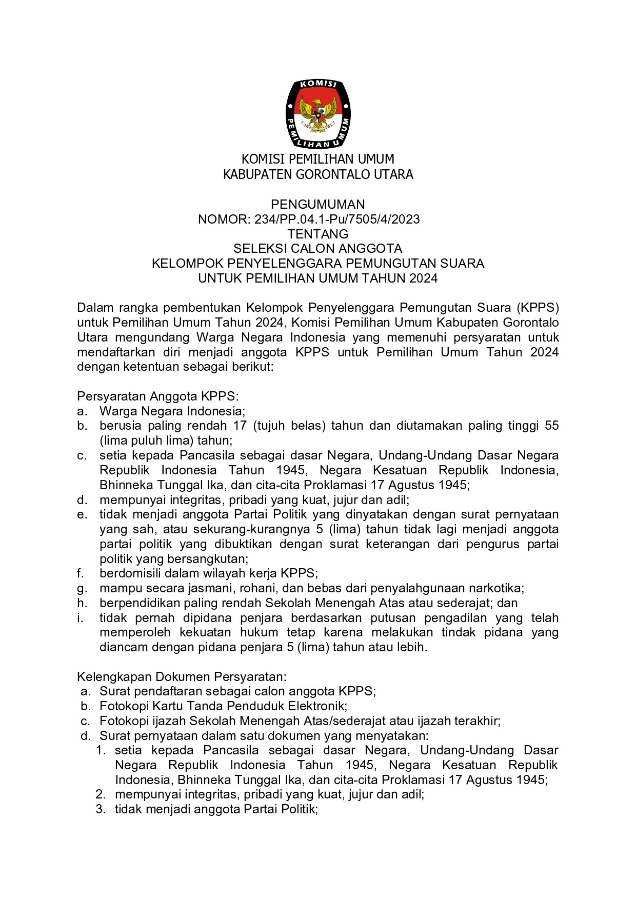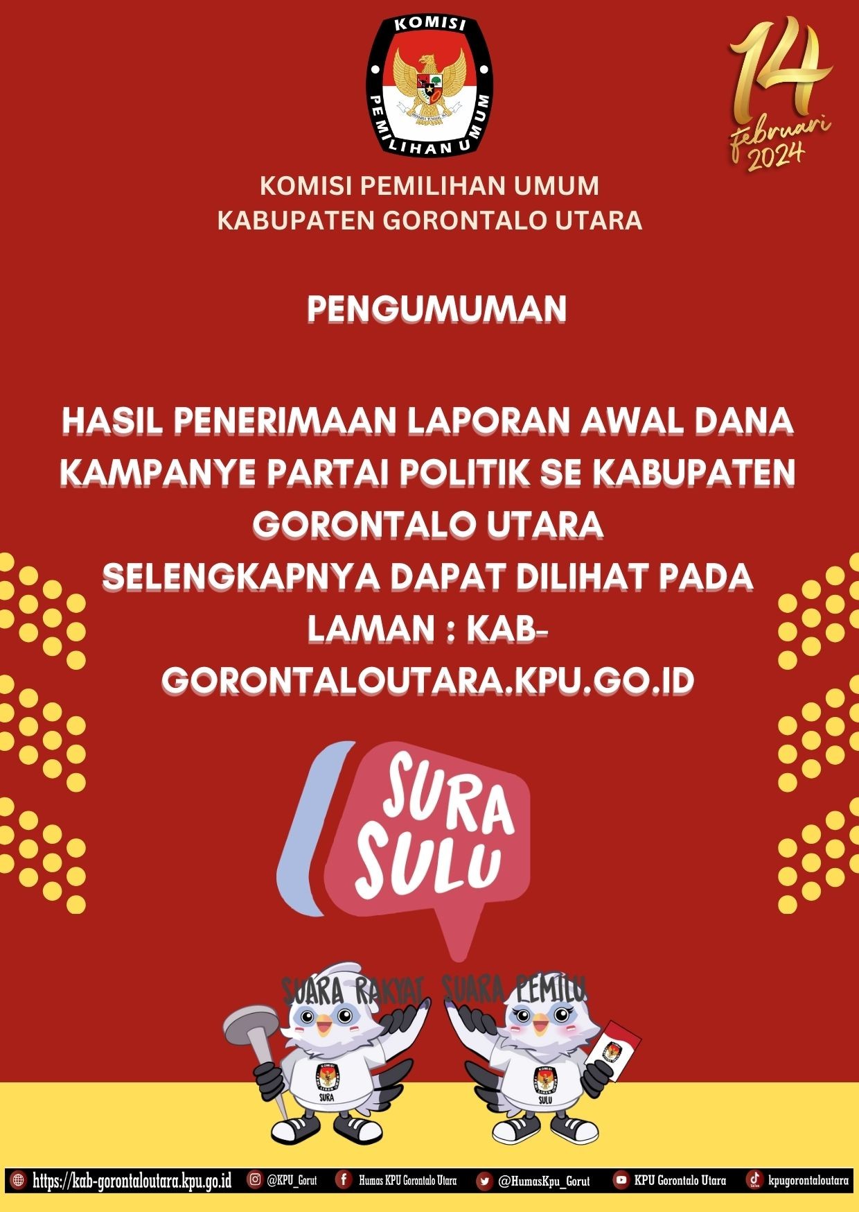 Untuk melaksanakan Pasal 12 Peraturan Komisi Pemilihan Umum Nomor 15 Tahun 2023 tentang Kampanye Pemilihan Umum yang menyatakan bahwa KPU Kabupaten mengumumkan nama tim Kampanye Pemilu Presiden dan Wakil Presiden sesuai dengan tingkatannya yang telah didaftarkan pada papan pengumuman dan/atau laman KPU, KPU Provinsi, atau KPU Kabupaten/Kota, KPU Provinsi Gorontalo mengumumkan nama Tim Kampanye Pemilu Presiden dan Wakil Presiden Pemilihan Umum Tahun 2024 tingkat Kabupaten Gorontalo Utara.