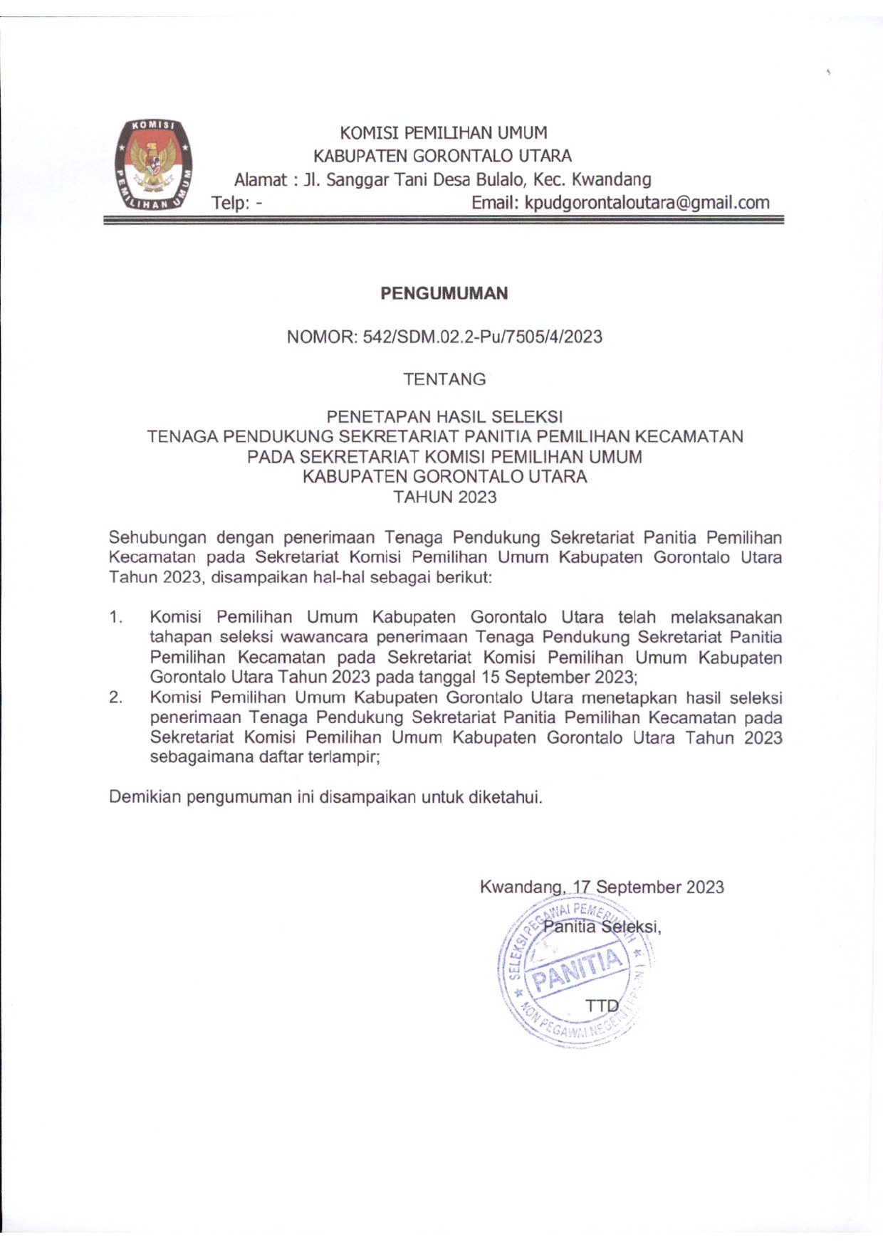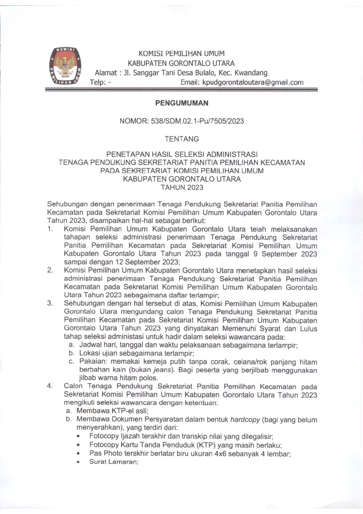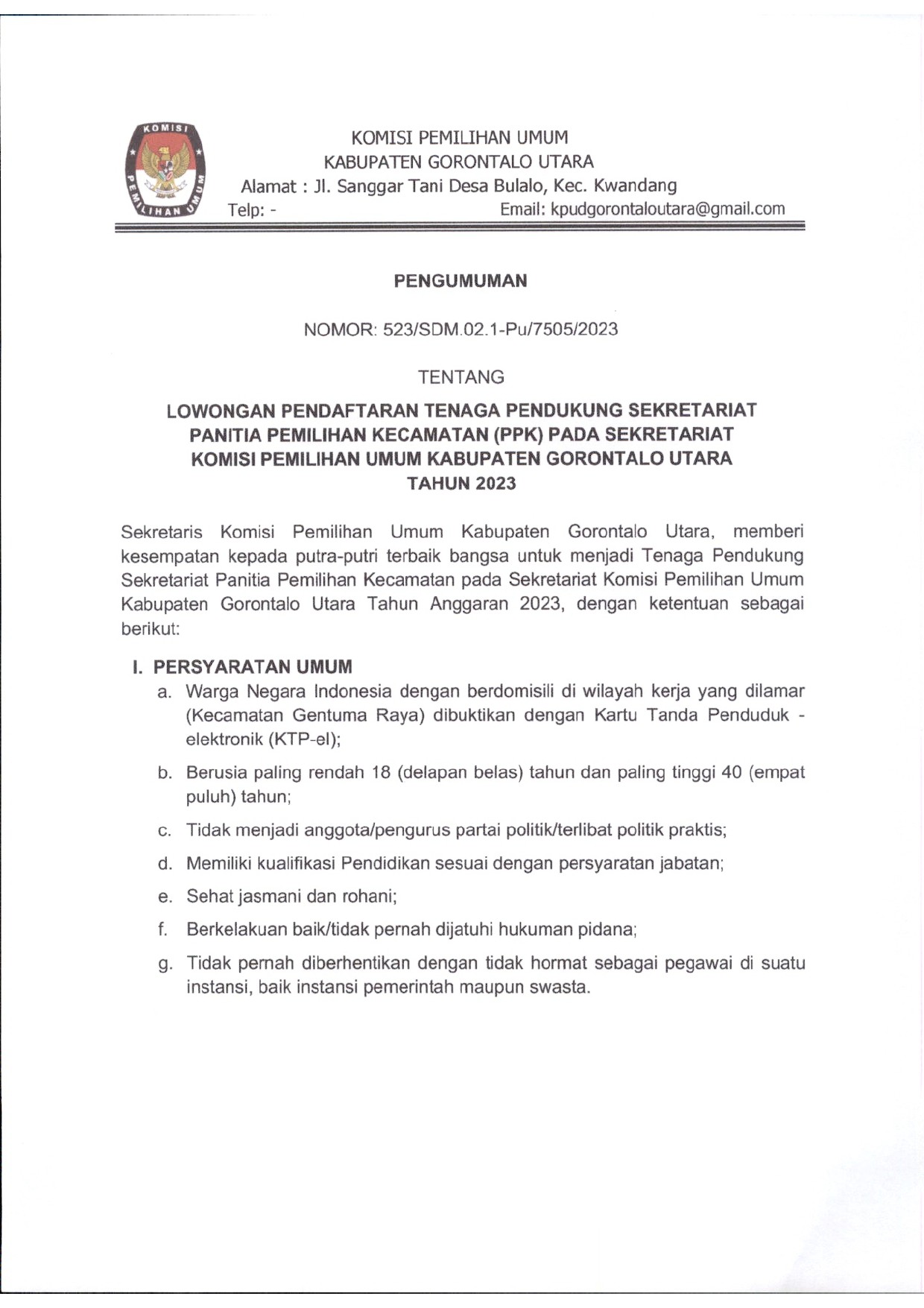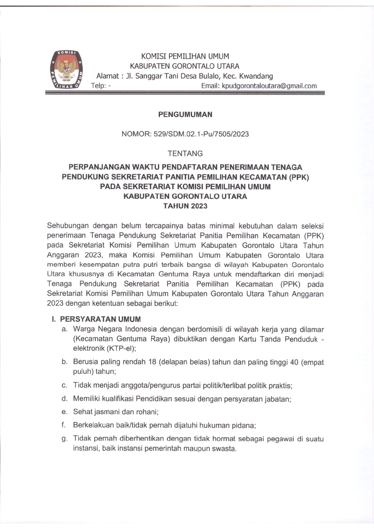#TemanPemilih.Sehubungan dengan belum tercapainya batas minimal kebutuhan dalam seleksi penerimaan tenaga pendukung sekretariat Panitia Pemilihan Kecamatan (PPK) pada sekretariat Komisi Pemilihan Umum Kabupaten Gorontalo Utara Tahun Anggaran 2023 pada beberapa Kecamatan, maka KPU Kabupaten Gorontalo Utara memberi kesempatan putra putri terbaik bangsa khususnya di Kecamatan Kecamatan Gentuma Raya untuk mendaftarkan diri menjadi tenaga pendukung sekretariat Panitia Pemilihan Kecamatan (PPK) pada sekretariat Komisi Pemilihan Umum Kabupaten Gorontalo Utara Tahun Anggaran 2023